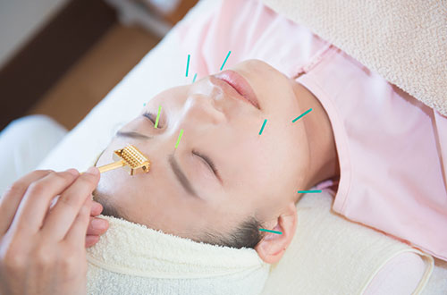 ツボ刺激と合わせ、顔の骨格に合わせて一番きれいに見えるラインを作り固定するよう鍼を刺します。また、こり固まった筋肉をほぐし顔や体の血流をよくしていきます。